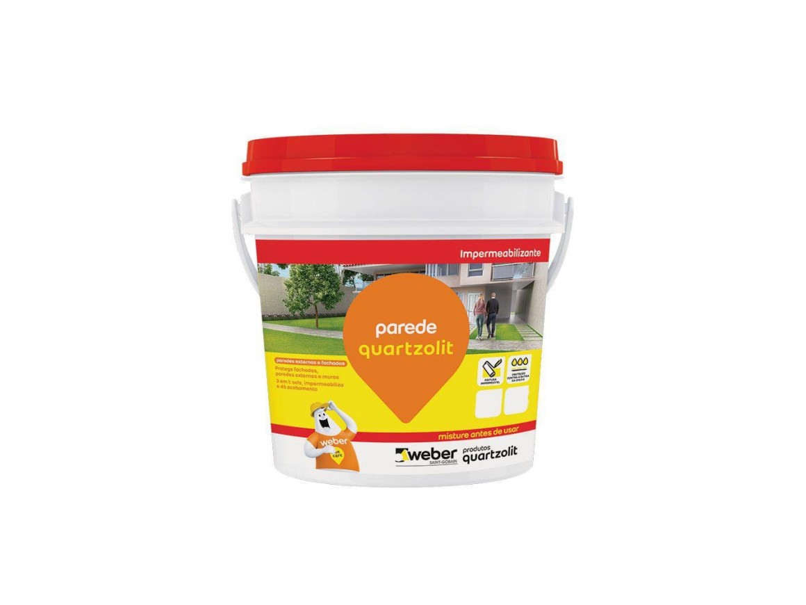 parede quartzolit é um impermeabilizante para paredes, indicado para a proteção de fachadas, paredes externas e muros. Possui tecnologia 3 em 1: sela, impermeabiliza e dá acabamento. Quando curada, forma uma membrana elástica e impermeável.