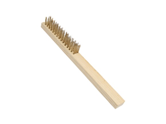 Base em madeira tratada. - Cerdas de aço Latonado com 3 fileiras com cabo. Indicações: - Utilizada na remoção de resíduos de paredes, rebocos estufados, produtos mofados, pinturas velhas e cal. - Indicada para o preparo e tratamento de superfícies metálicas, de madeira ou alvenaria.