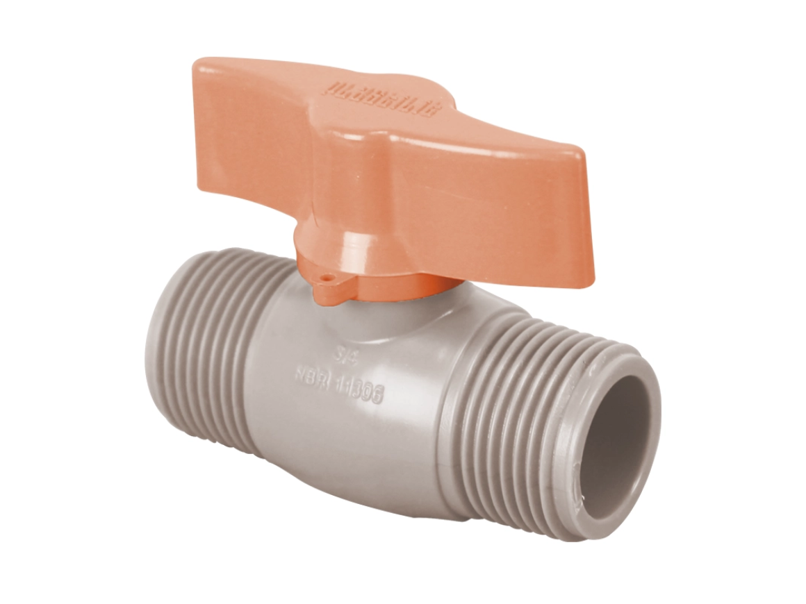 Registro de PVC utilizado para executar o bloqueio de vazão em instalações hidráulicas prediais de água fria. Aplicável com tubos, conexões e acessórios com rosca interna.