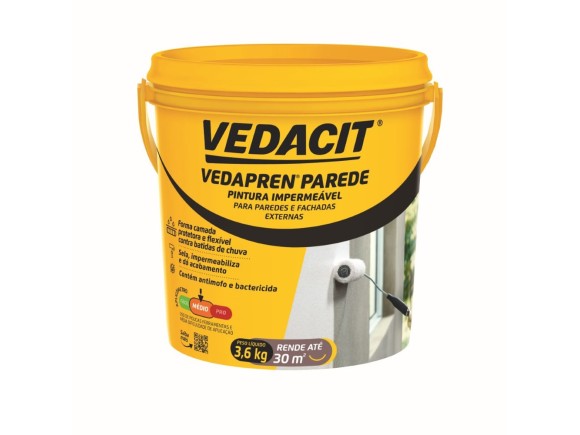 VEDACIT VEDAPREN BRANCO é uma manta líquida, de base acrílica e aplicação a frio sem emendas, pronta para uso e moldada no local. Cobre a estrutura com uma proteção impermeável e apresenta ótimas características de elasticidade, flexibilidade e aderência, tendo uma grande durabilidade e alta resistência às intempéries. Proporciona excelente acabamento, além de refletir os raios solares, o que reduz parte do calor absorvido pela estrutura. VEDACIT VEDAPREN BRANCO dispensa proteção contra os raios solares.