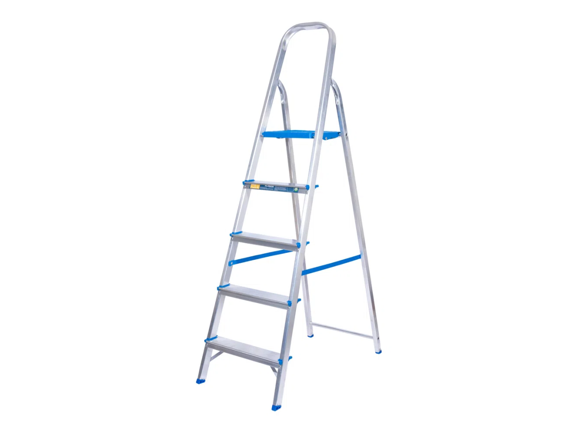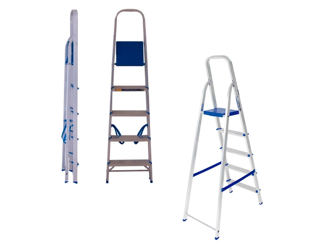 A Escada Residencial é perfeita para alcançar o alto da estante ou troca a lâmpada da cozinha. Ela possui pés e degraus antiderrapantes e tem os pés fixados nos perfis de alumínio, evitando que escapem.